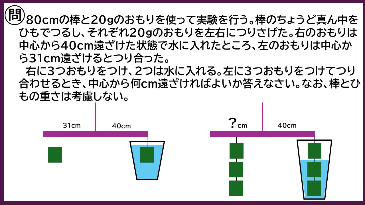 しかし、講習を受講している児童は「難しい問題」と聞くとワクワクするようで、左右のてんびんがつり合うということは、「支点からの距離×おもりの重さ」が左右で等しいという前提知識を基に、一生懸命楽しそうに取り組んでいました。