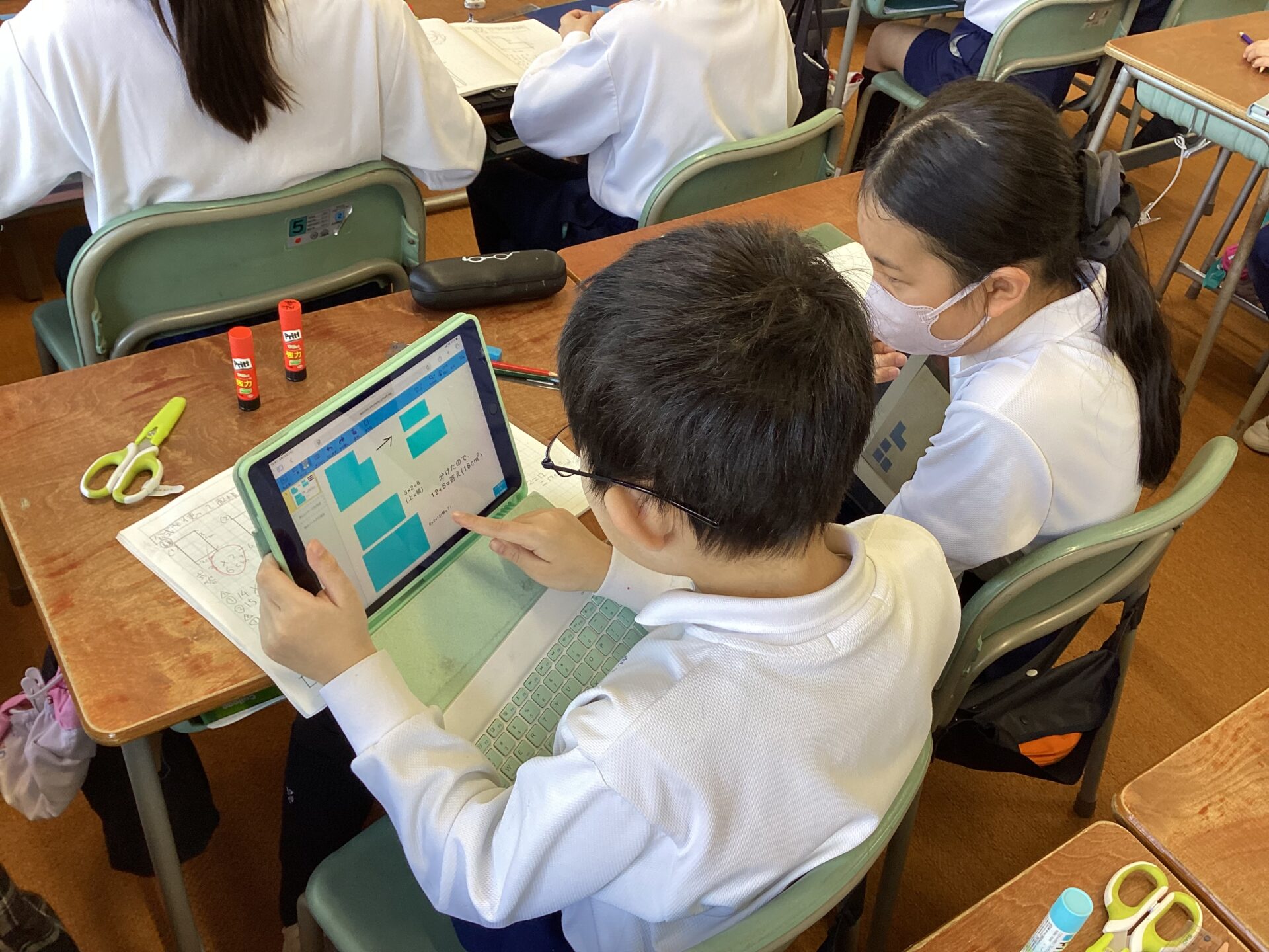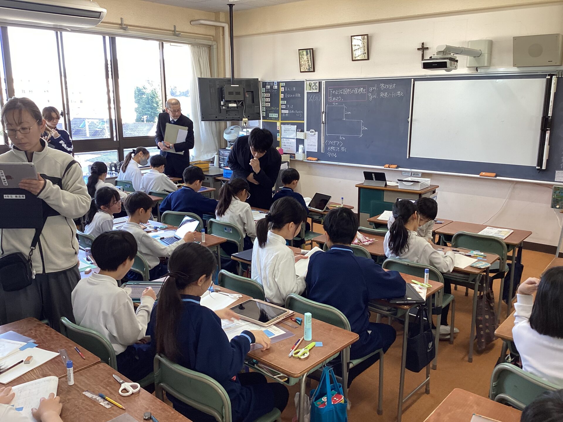 L字型の図形の面積をどのように求めるのか,子どもたちは図形プリントやデジタル端末を駆使しながら