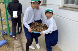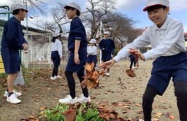 たてわりごとに分かれて、学校の様々な場所の落ち葉を拾いました。