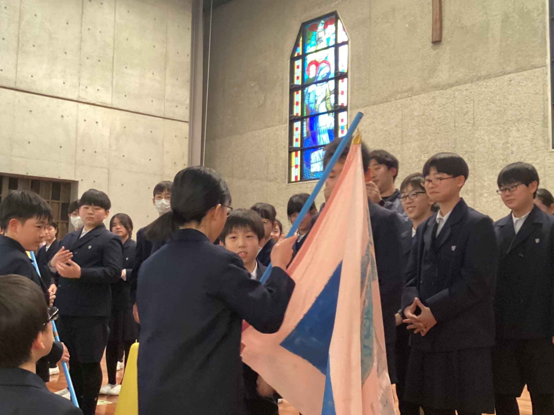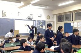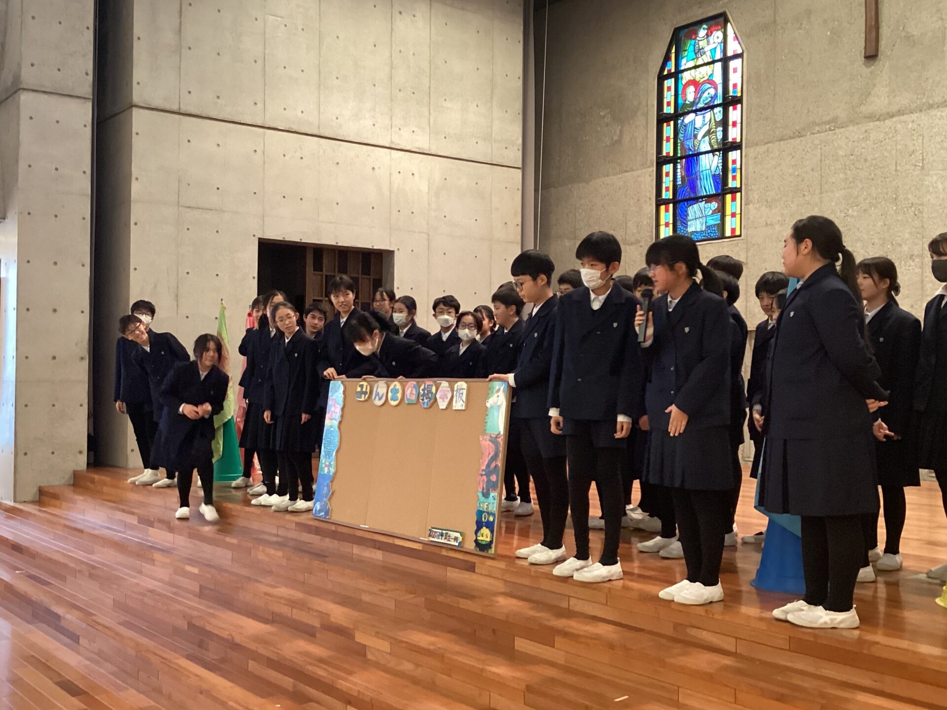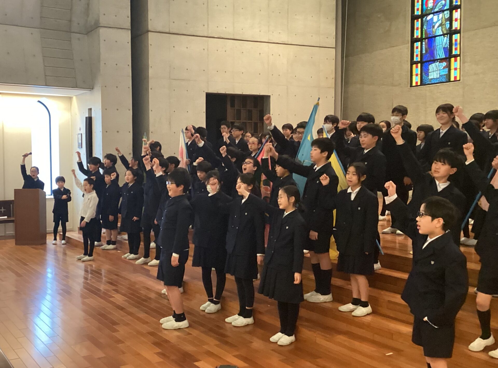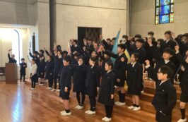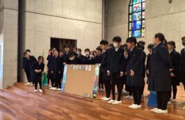 第2部は全校が聖堂に集まり,1年生~5年生から6年生に,感謝のメッセージや歌のプレゼントをしました。